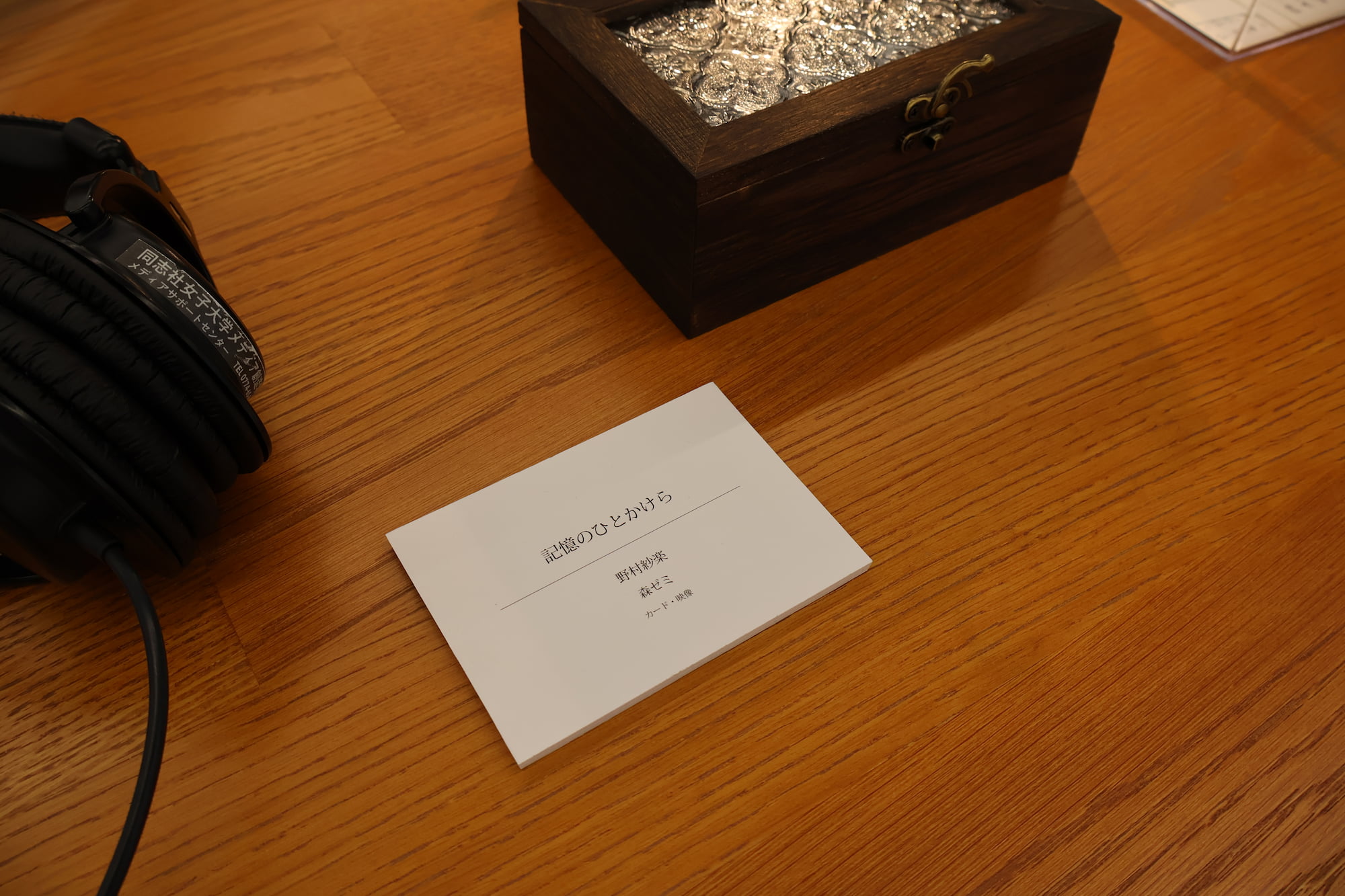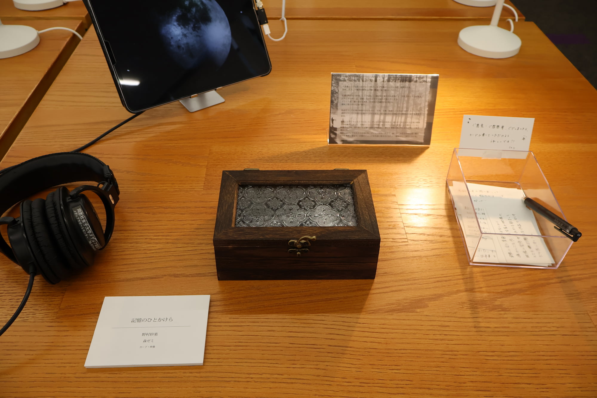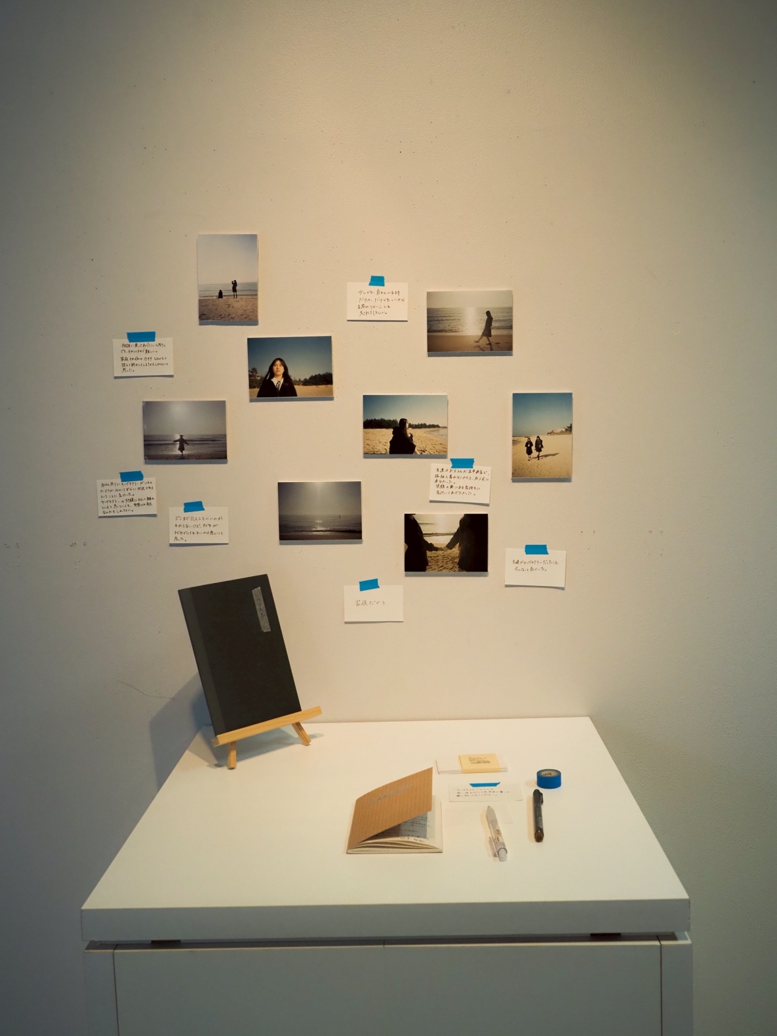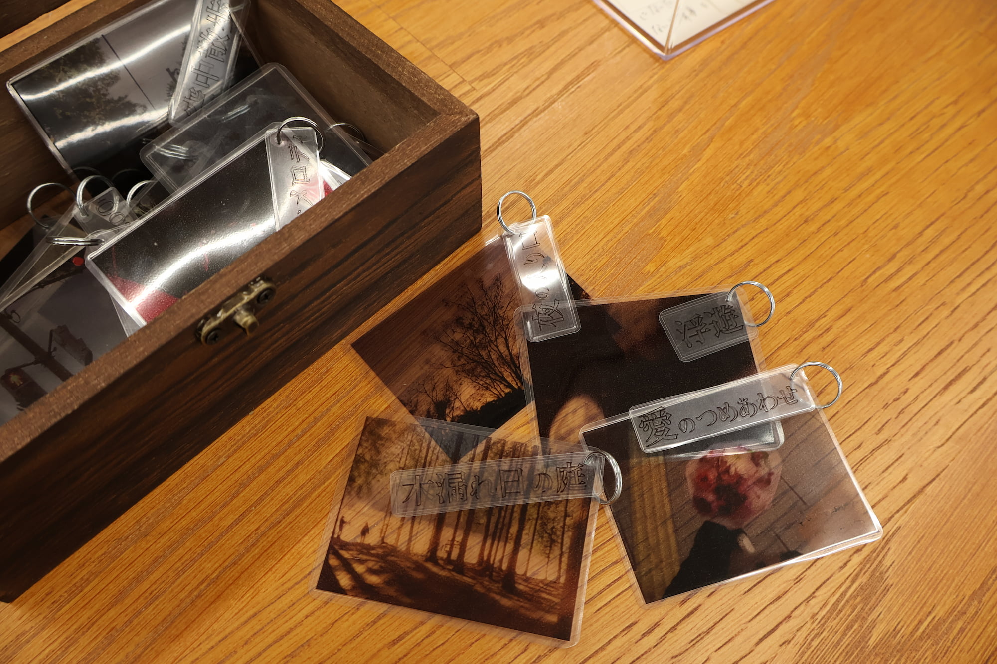 透明なカードの写真は記憶の一コマであり、それぞれのカードにはその瞬間に付随する感覚をすくい上げた言葉を添えました。鑑賞者が箱を開け、一枚ずつカードを取り出す。その手に取る時間そのものが、自身の記憶を静かに手繰り寄せる動作と重なるよう意図しています。透明な素材は、触れれば揺らいでしまいそうな記憶の儚さを象徴しています。