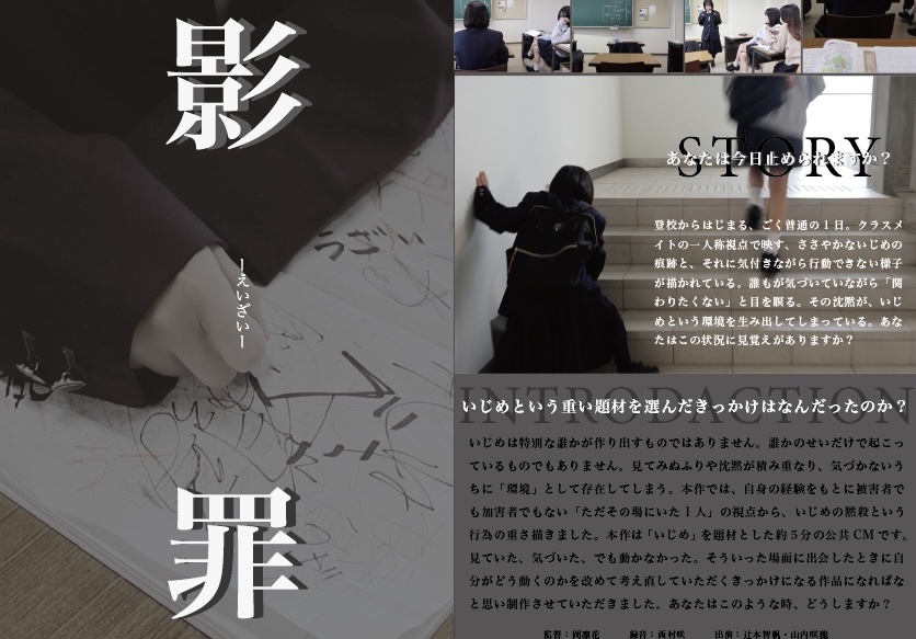 いじめは特別な誰かが作り出すものではありません。誰かのせいだけで起こっているものでもありません。見てみぬふりや沈然が積み重なり、気づかないうちに「環境」として存在してしまう。本作では、自身の経験をもとに被害者でも加害者でもない「ただその場にいた1人」の視点から、いじめの然殺という行為の重さ描きました。本作は「いじめ」を題材とした約3分の公共CMです。見ていた、気づいた、でも動かなかった。そういった場面に出くわしたときに自分がどう動くのかを改めて考え直していただくきっかけになる作品になればなと思い制作させていただきました。