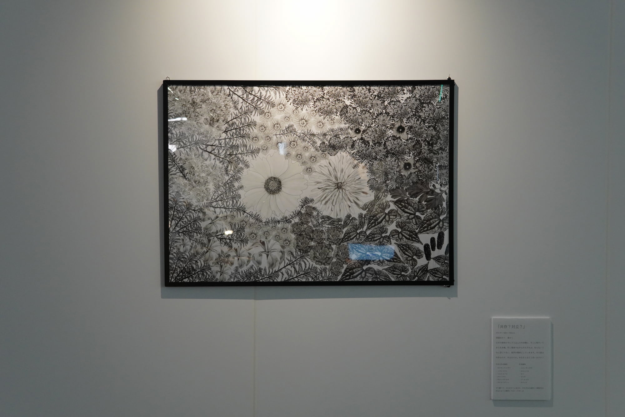 日本の植物の中に入り込んだ外来種と、そこに根付いてきた在来種。同じ環境で生きるそれぞれは、知らないうちに混じり合い、境界を曖昧にしていく。その姿は共存なのか、対立なのか。そんな植物たちの様子をデジタルで描き、ポスターにした。パッと見ただけでは、何が何の植物か分からず、単純な植物のポスターになってしまう為、キャプションには作中の外来植物、在来植物を紹介し、見た人に自由に解釈して貰う作品になっている。