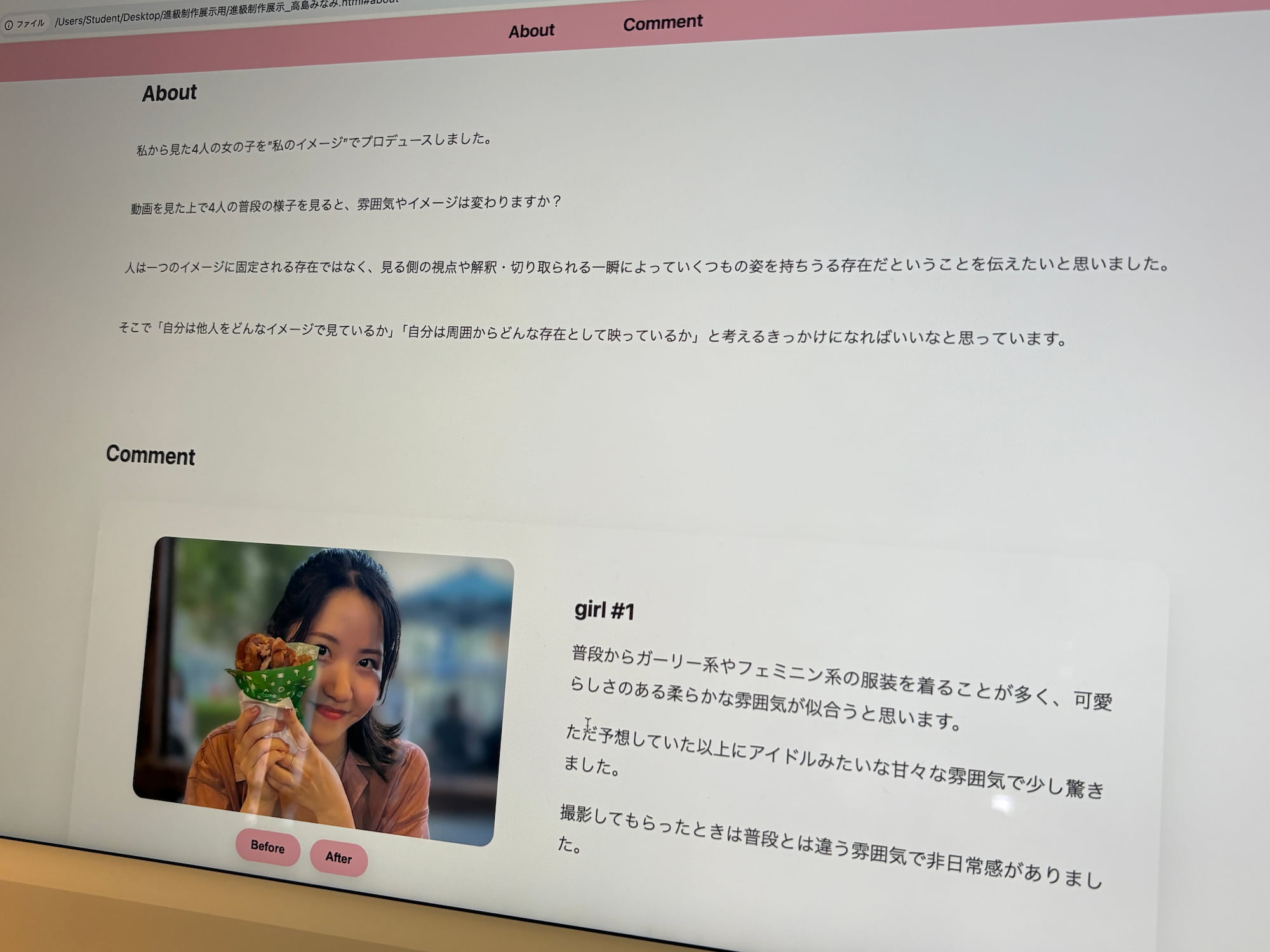 本作に使用した顔モデルは、現在の女性芸能人人気ランキングやそれに基づく学内アンケートの結果をもとに制作した。SNSの発展により、他者と比較される機会が増え、ルッキズムはより身近で加速する問題となっている。