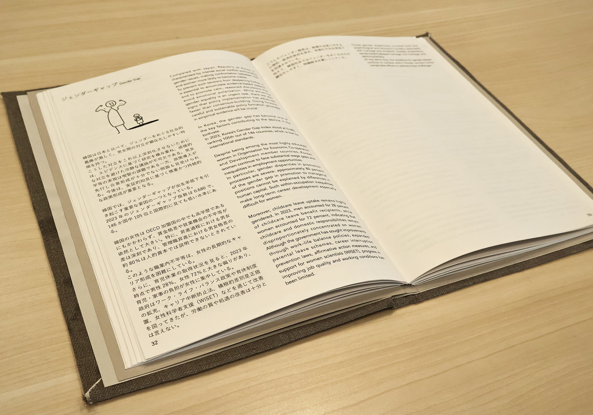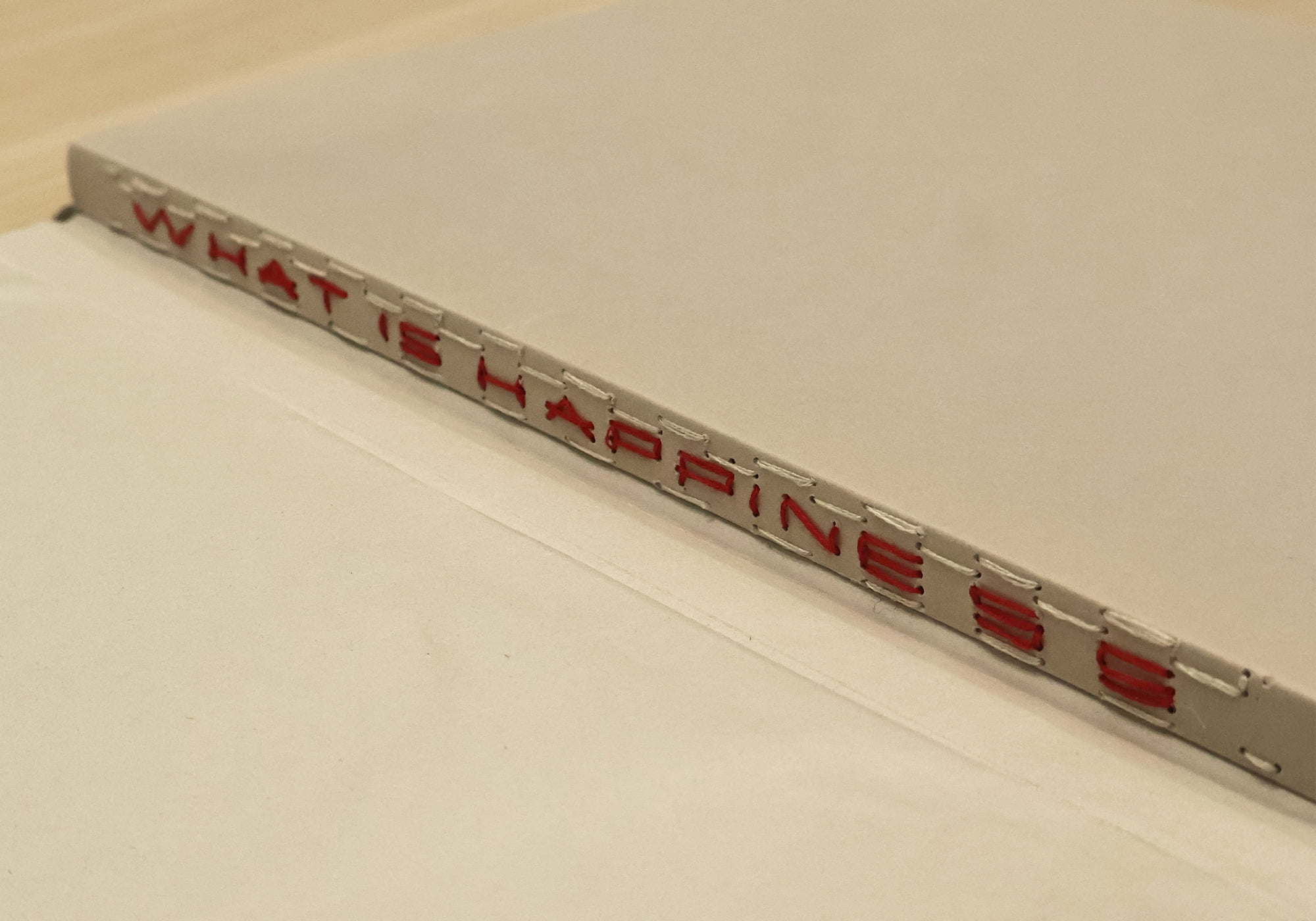 さらに、今回スイス装にも挑戦し、表紙を捲っていちばん初めに目に入る背表紙には、特殊な製本方法によって「WHAT IS HAPPINESS」という文字を施し、本を開いた瞬間幸福について問いかけられるデザインとした。