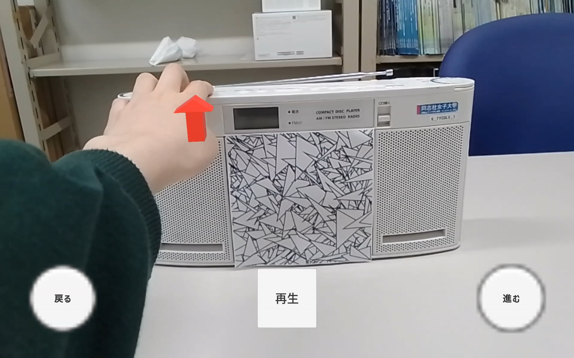 ラジオデッキのCDトレイ部分にマーカーとなる画像を貼付し、その画像を認識して矢印の3Dオブジェクトを表示する設計としました。