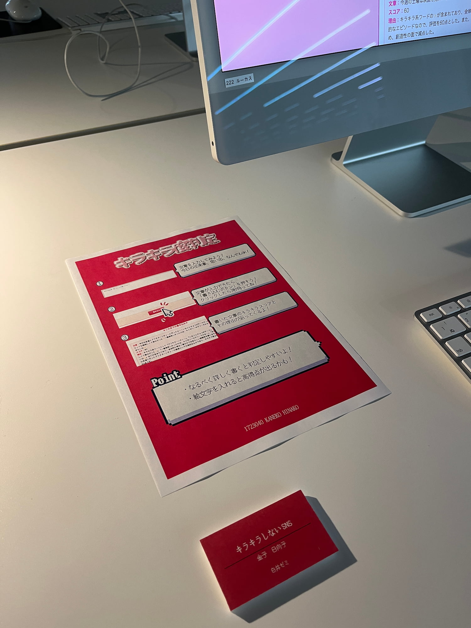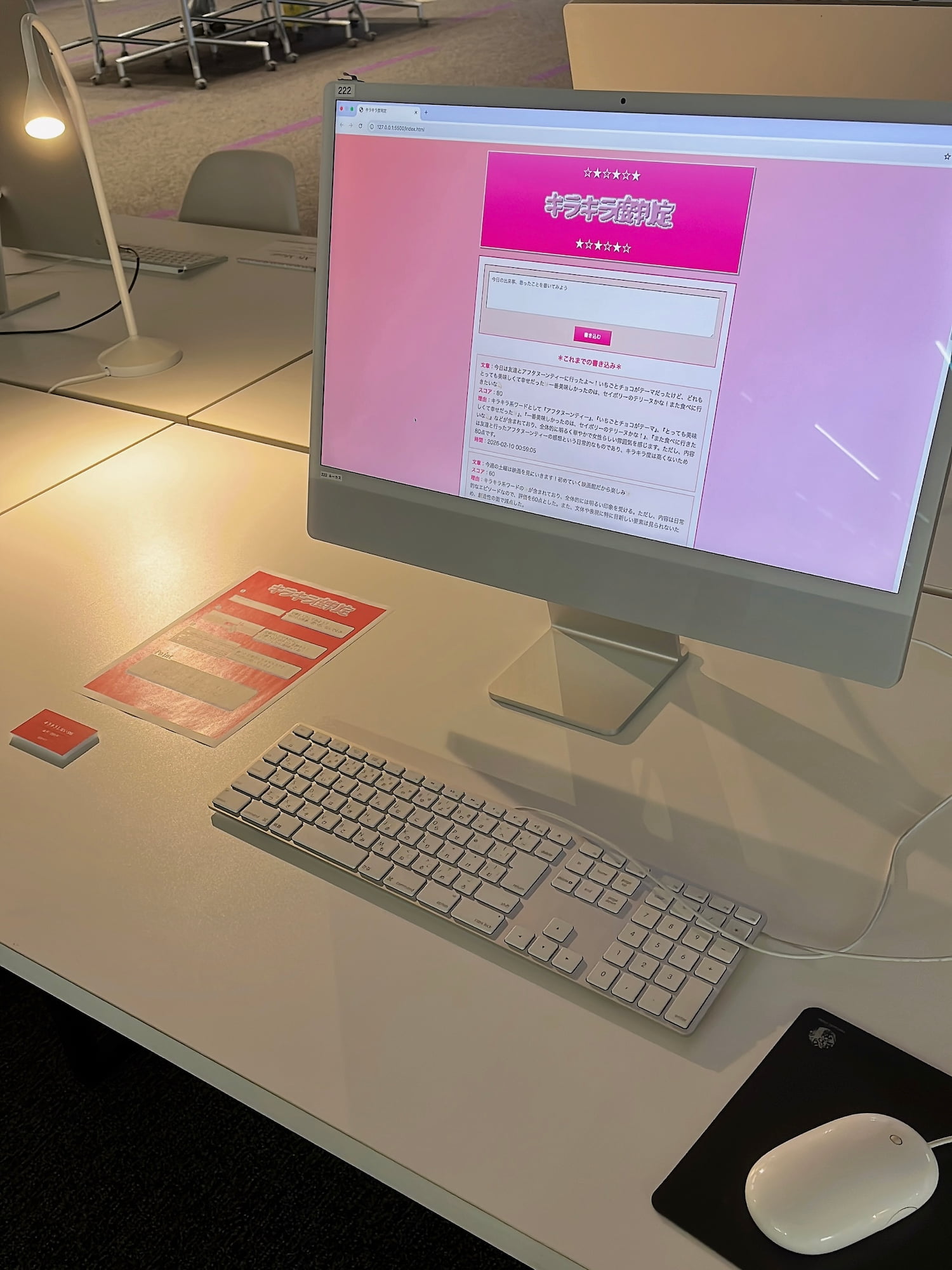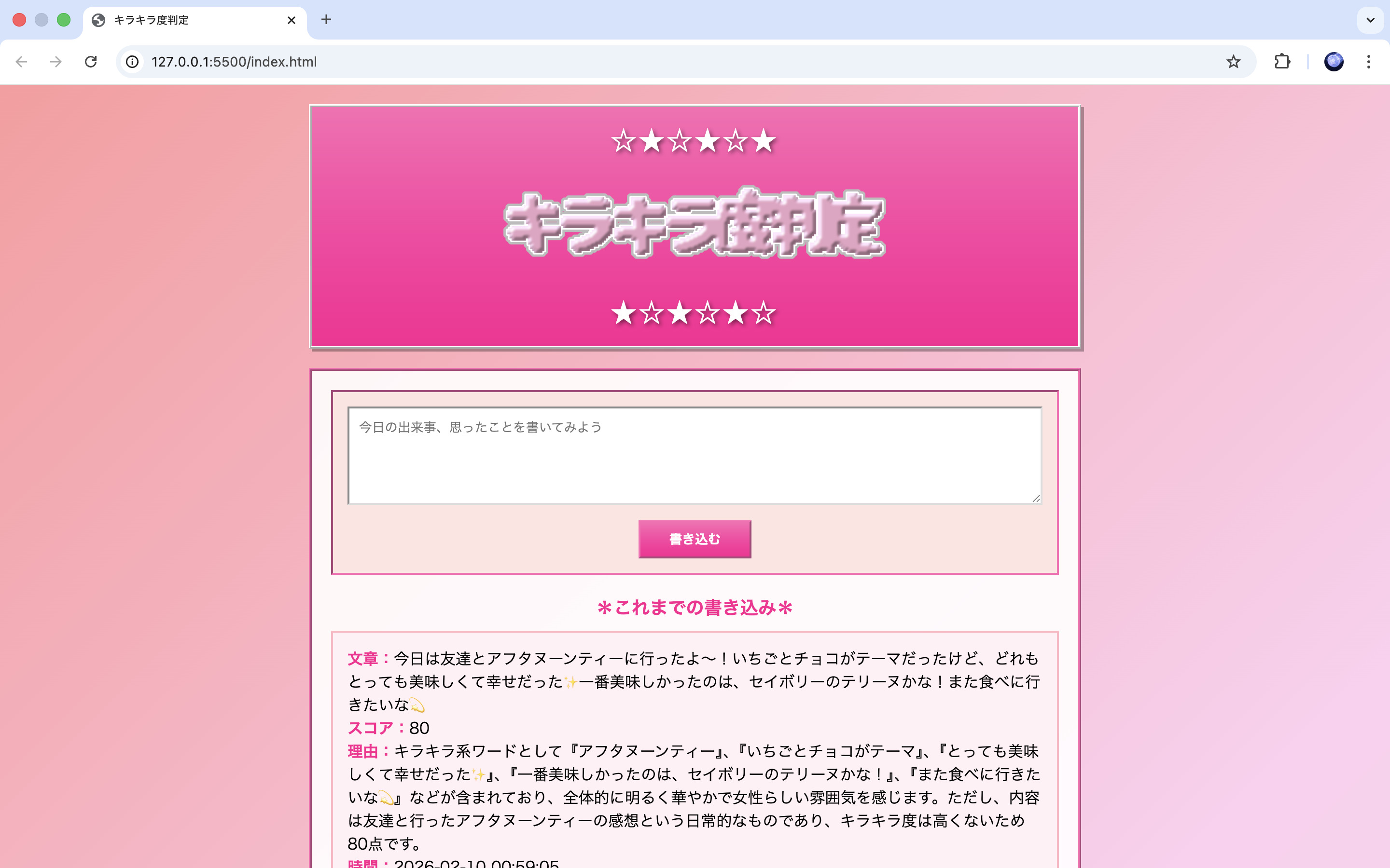 書き込んだ文章の「キラキラ度」を判定してくれるシステムです。書いた文章を「キラキラ系ワードの有無や頻度」、「全体的な印象や雰囲気」、「内容やテーマとの親和性」、「表現や文体の創造性」の4項目で判断し、100点満点でスコアを返してくれます。誰かの偏った見方で点数をつけないよう、AIにスコアを判断してもらうやり方を採用しています。