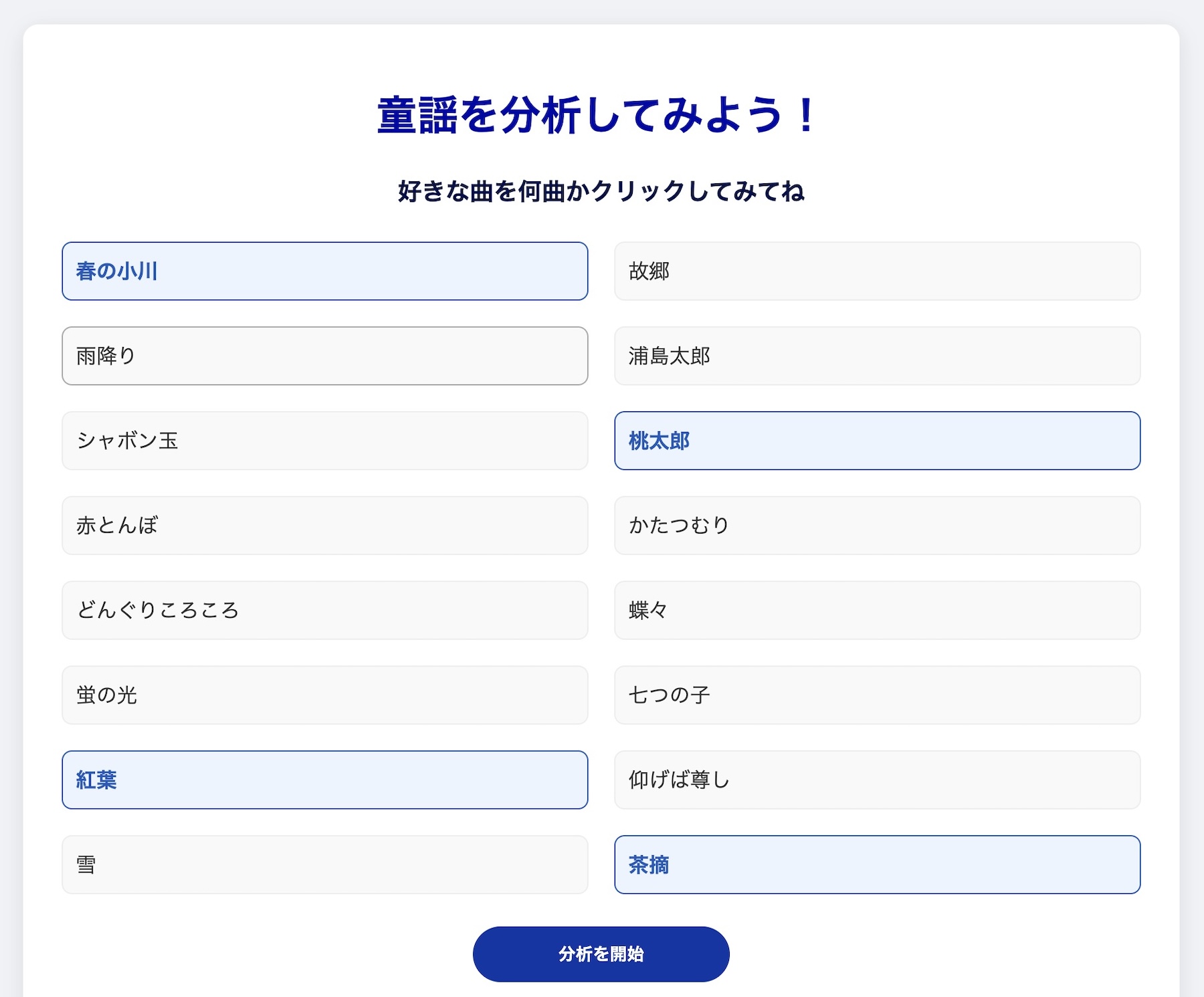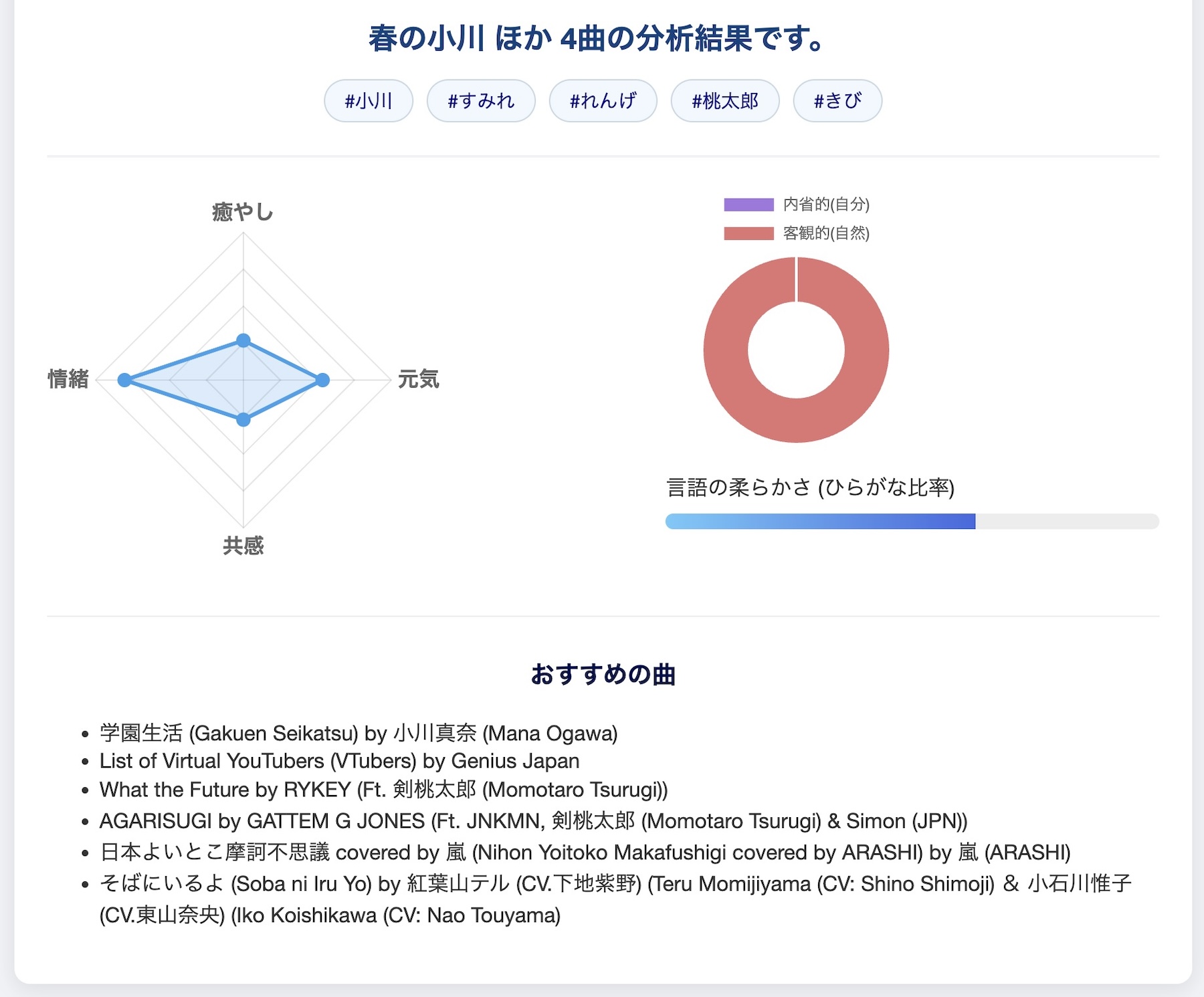 選んだ童謡の歌詞を分析し、歌詞から嗜好を可視化し、自分の好きな系統の歌詞はどんなものなのかというのを知ることができるWebサイトです。また、その歌詞の嗜好にあったおすすめ曲の提示もされます。選んだ歌詞を分析してみるとどういった結果になったのか、童謡から導き出される歌詞の特徴は新鮮で面白いです。試作段階のものなので少し結果に偏りはありますが、歌詞分析がどういったものなのか、何がどのように分析されるのかというものを試してくだされば嬉しいです。