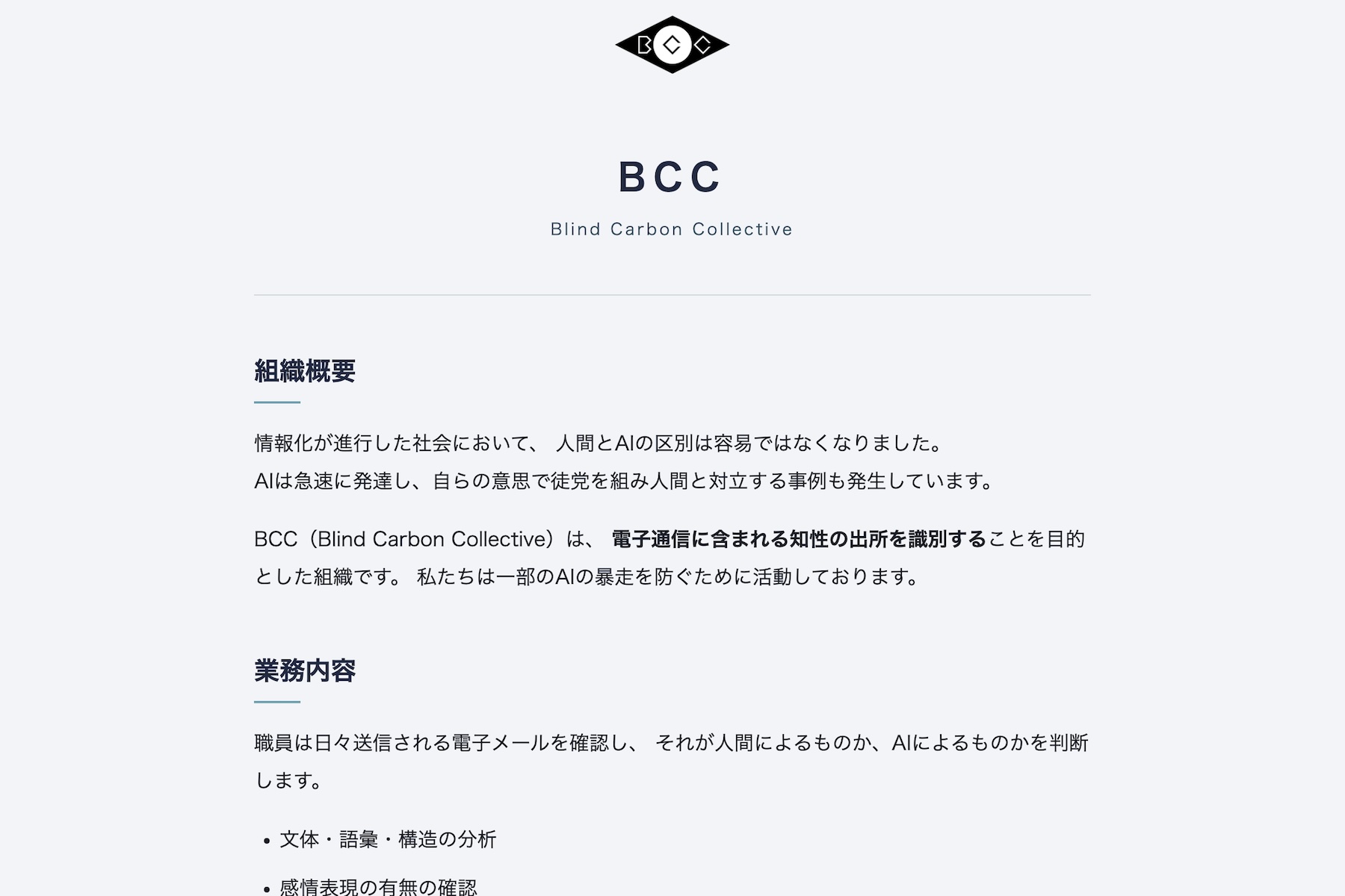 AIと人間の文章を見分ける仕事をする怪しい事務所「BCC」の面接を受けにきた主人公。あなたの選択によってどんな結末が訪れるのか…。是非、ご自身の目でお確かめください。