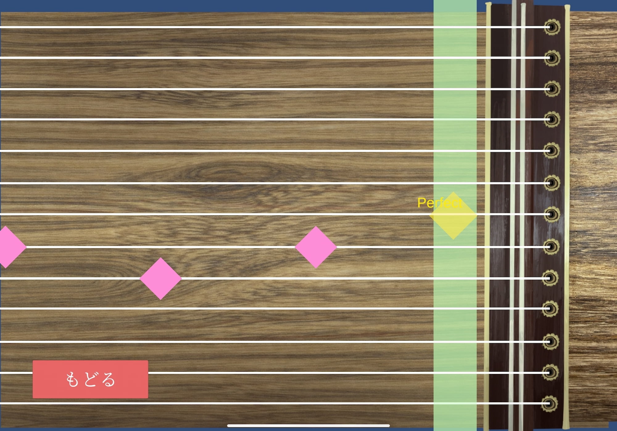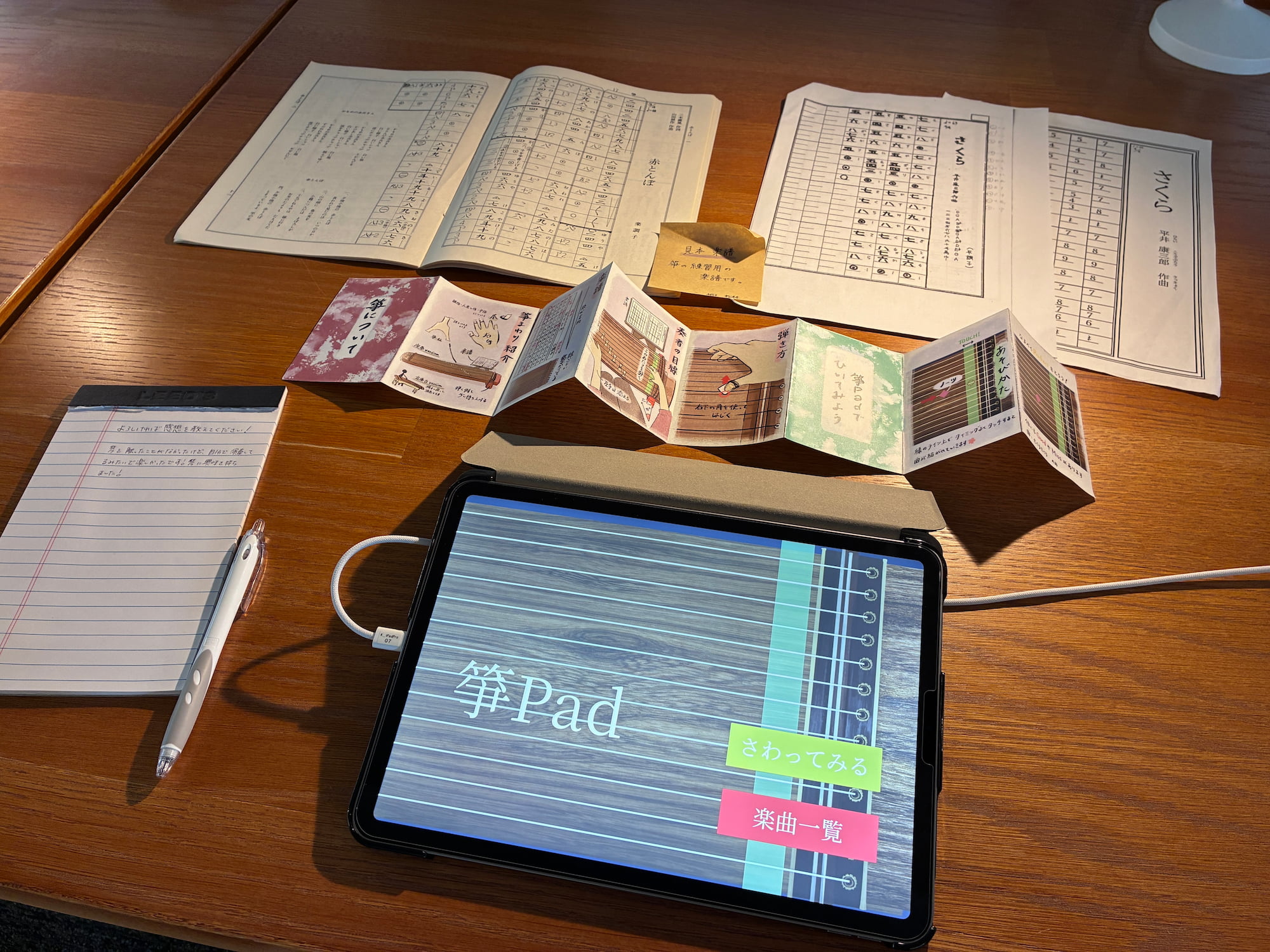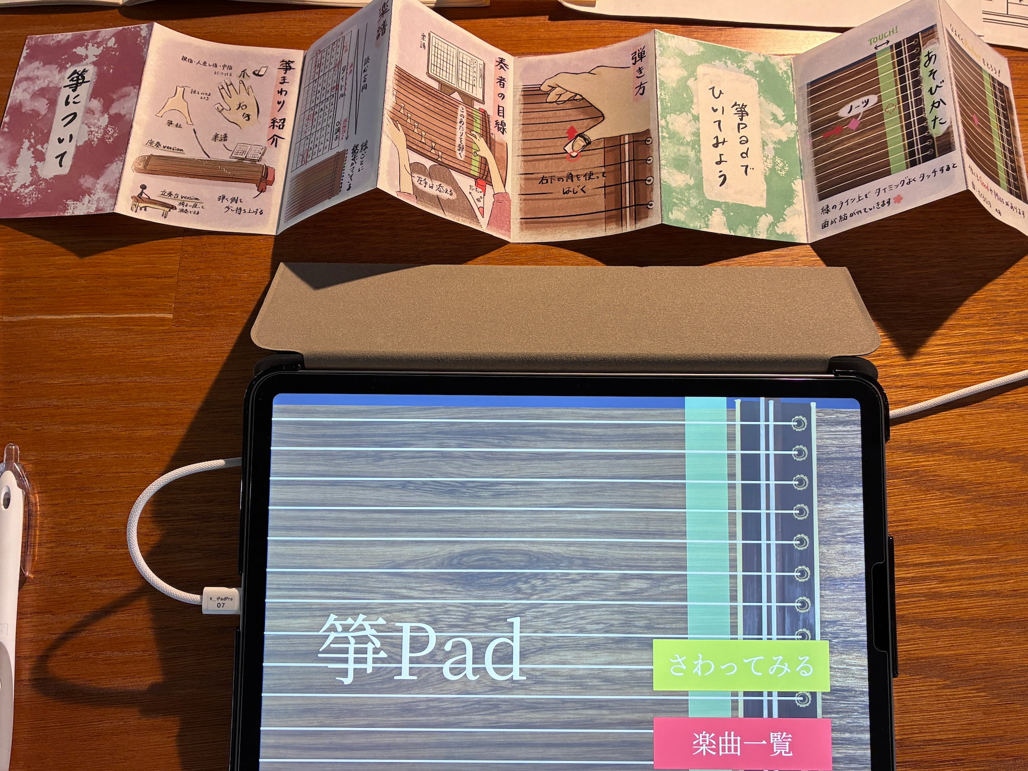 「演奏」モードでは、箏初心者が初期に練習する定番曲「さくらさくら」の音楽ゲームを体験できる。縦譜は初心者には読みにくいという課題があるため、本作品では楽譜を使用せず、流れてくるノーツをタイミングよくタップすることで演奏が完成する仕様とした。判定はPerfect、Good、Missの3段階で表示される。また、ゲーム意外にも箏の基本的な情報をまとめた解説パンフレットを設置し、楽器への理解を深められるよう工夫した。