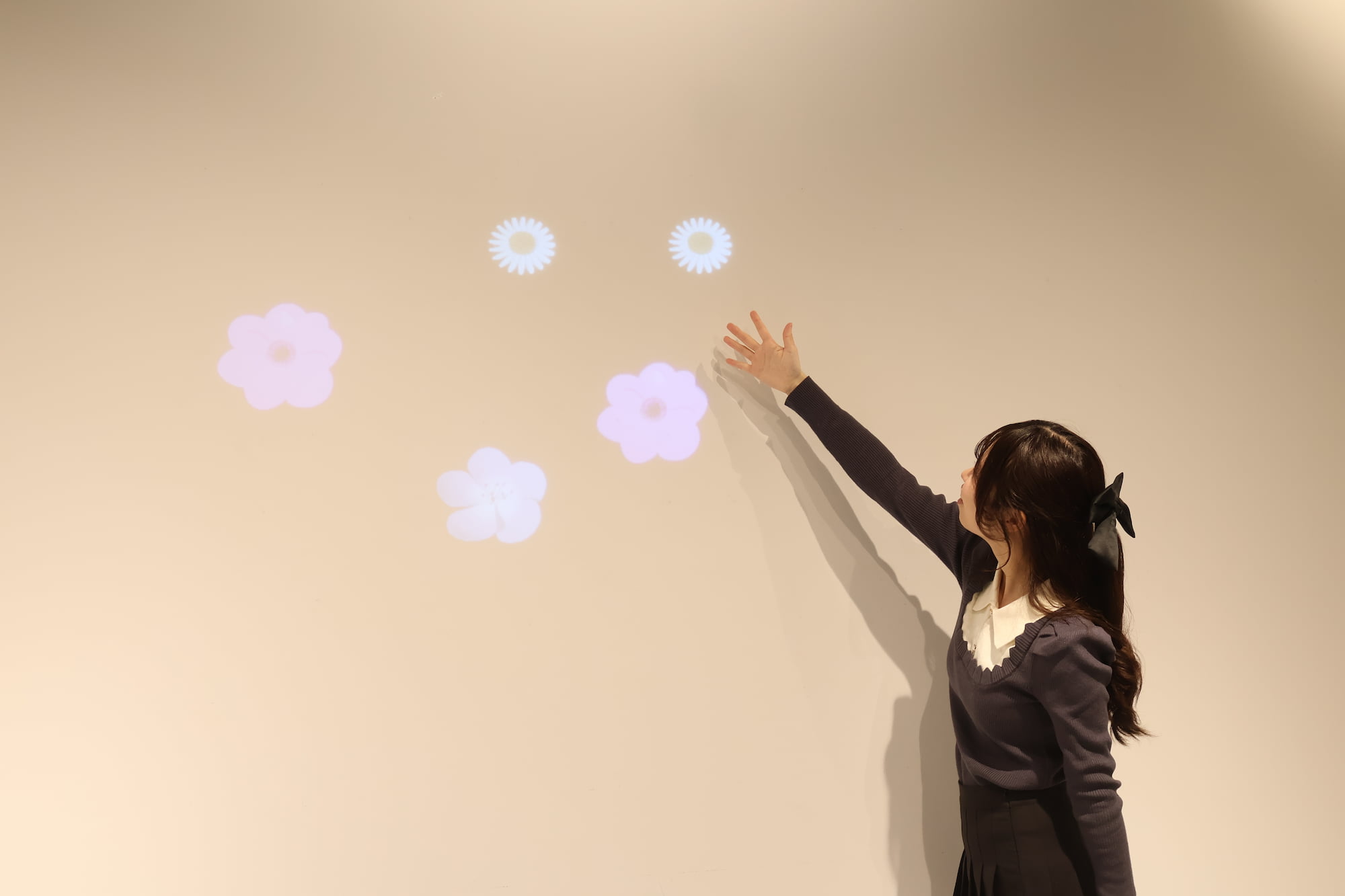 この作品は、手の動きに反応して蕾が現れ、花が咲く映像インスタレーション作品です。体験者は自身の身体の一部である「手」を用いて作品と関わります。身体の動きが直接映像へ反映されることで、鑑賞者ではなく“参加者”として空間に入り込み、没入感のある体験を得ることができます。