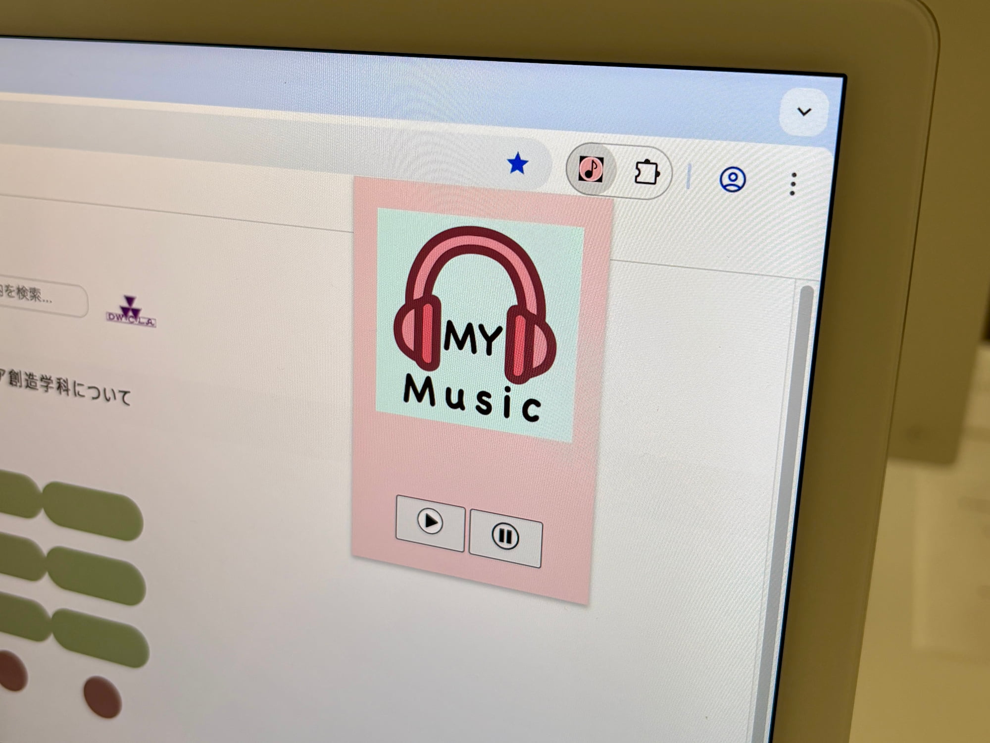 Google Chrome内で使用できる音楽再生システムを開発いたしました。本システムはJavascriptとChrome拡張を使用しており、ネットサーフィンをしながら音楽体験をすることが可能です。工夫した点は、Off Screen APIの活用によりタブを遷移しても途切れず聞くことができる点です。また、連続して同一の曲が流れないプログラムに設定したこともこだわりの一つです。現時点では、再生/停止の操作を利用者自信が行うことで音楽体験ができます。この作品の最終目標としては、読み込んだサイト内の文章を分析し、その内容に応じて適切なジャンルの音楽を自動再生するシステムの完成です。