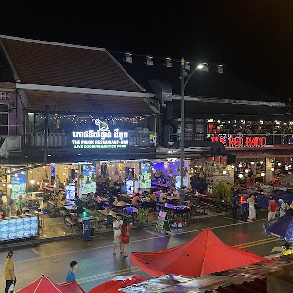 夜はキラキラとランタンの光る橋があったり、パブストリートは観光客で賑わっています。たった100メートルの通りに、レストランをはじめとする様々なお店がギュっと集まり、絶え間なく音楽が流れ、ネオンも派手。