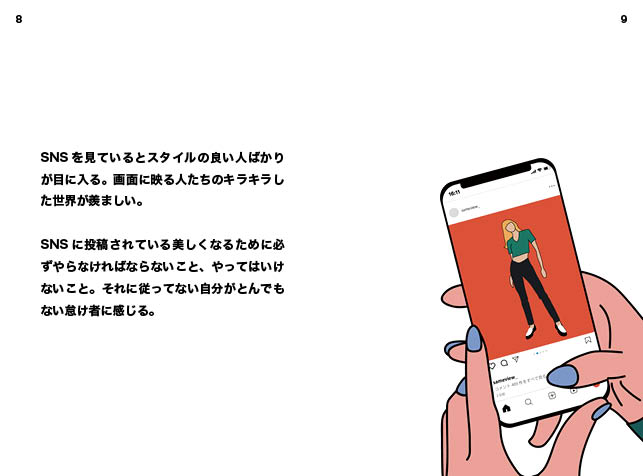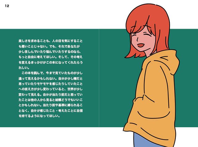 SNSなどで美しくなることを強制されているように感じることがある。必要以上に見た目を気にしたり美しさを求めたりすることで、少し辛くなったり悲しくなったりすることがあるかもしれない。同じようなことを感じている同世代の女性に向けてもっと自分の考えに自信を持って、自由に生活できるようにわたし自身の考えやメッセージをイラスト共にかいた冊子。この本を読んで今まで見ていた世界が少し違って見えて、少しだけ楽に、自由になってほしい。