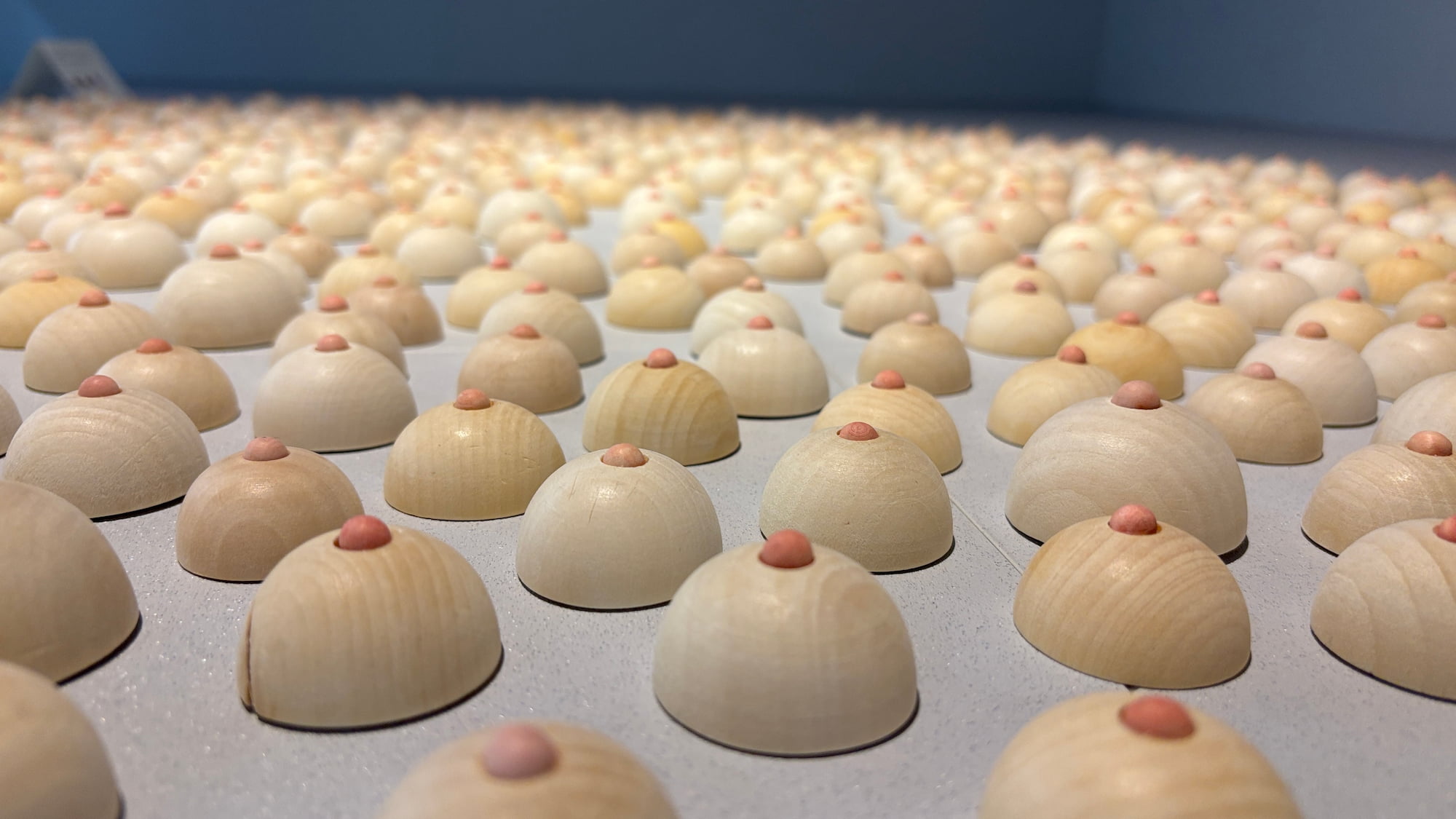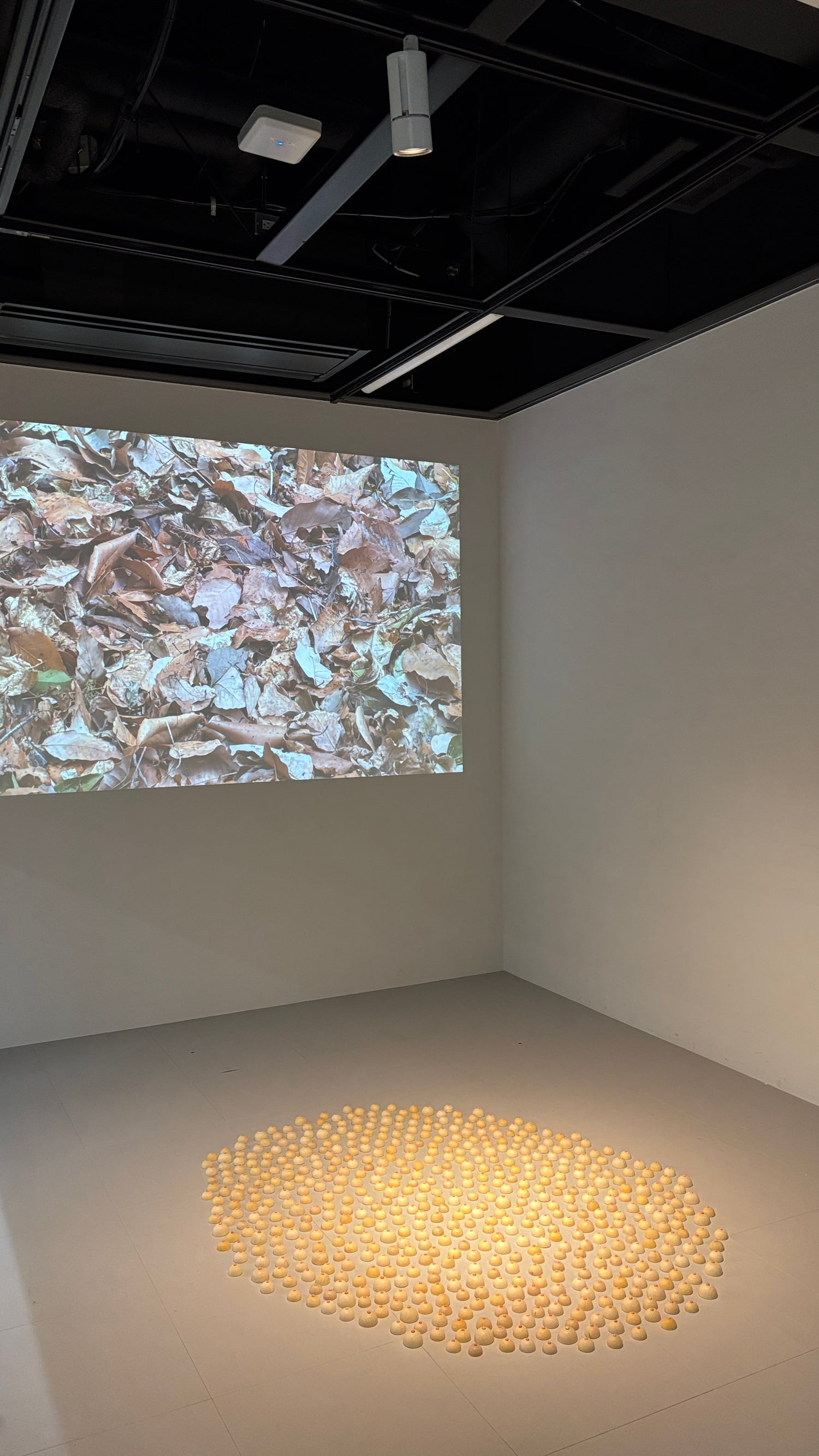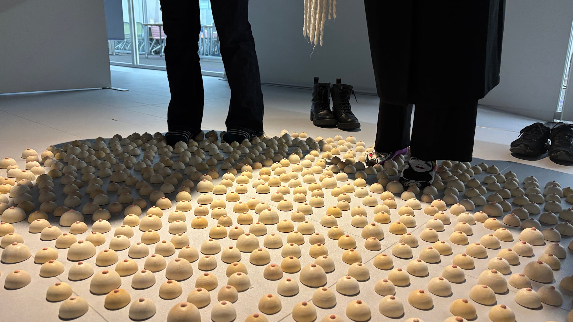 インスタレーションと映像を合わせて一つの作品になっています。インスタレーションは、乳防型の足ツボになっています。女性の象徴として乳房を用いています。今私がこうして大学に通うことができるのも、選挙に行くことができるのも、過去の女性たちの奮闘のおかげです。虐げられてきた女性の上に自分が立っていることや、彼女たちの痛みを物理的に感じられるように制作しました。映像はインスタレーションのメッセージを捕捉するような形で制作しました。途切れ途切れに出てくる文章は、連邦最高裁判所判事のRBGの言葉を一部引用しています。