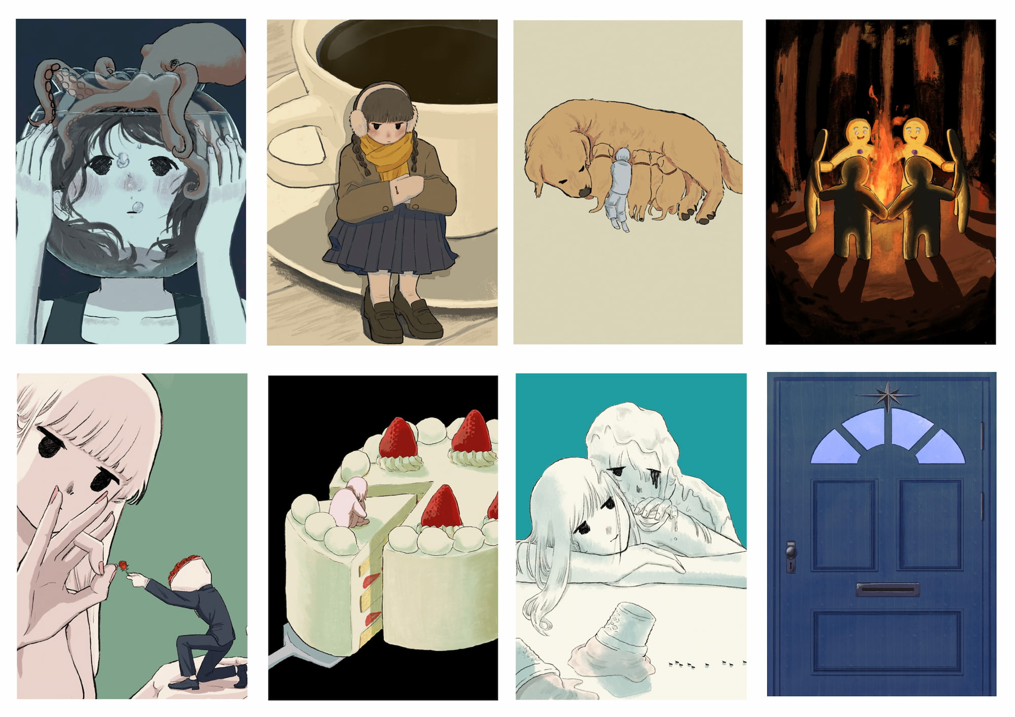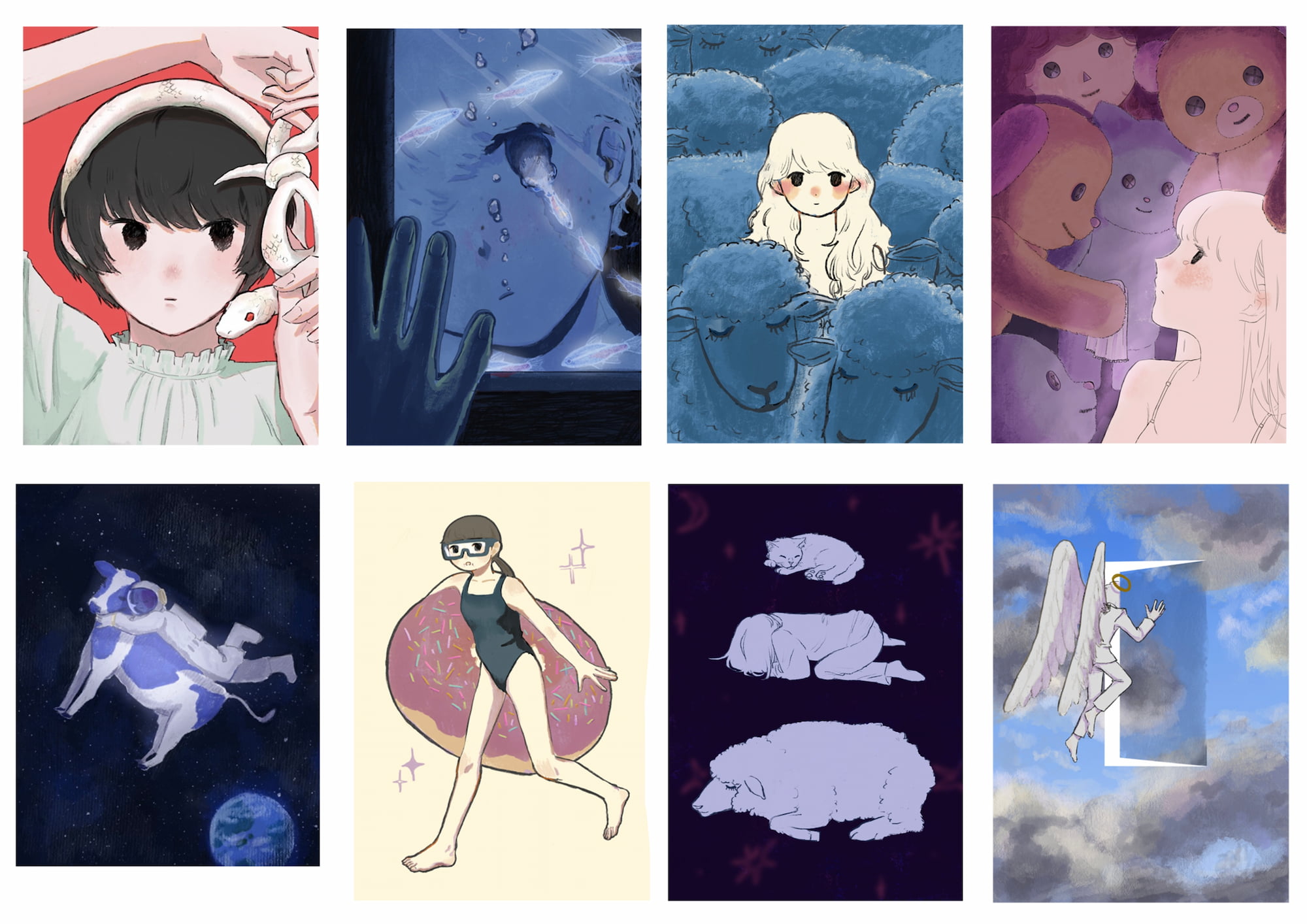 作品のテーマは現実逃避です。辛い現実から逃げ切り、空想の世界に浸りたいという想いから『逃亡』というタイトルをつけました。カード枚数は、現実の重苦の数だけ逃避が起こるという考えから、19(重苦)種ご用意しました。本作品を通して、新たな無意識の逃亡世界を皆様に提案することを目的としております。作品の制作期間中は、アイデア探しのためにも、突拍子も無い空想をする時間が増えたので、ある意味私にとってもいい現実逃避ができたのではないかと思っています。