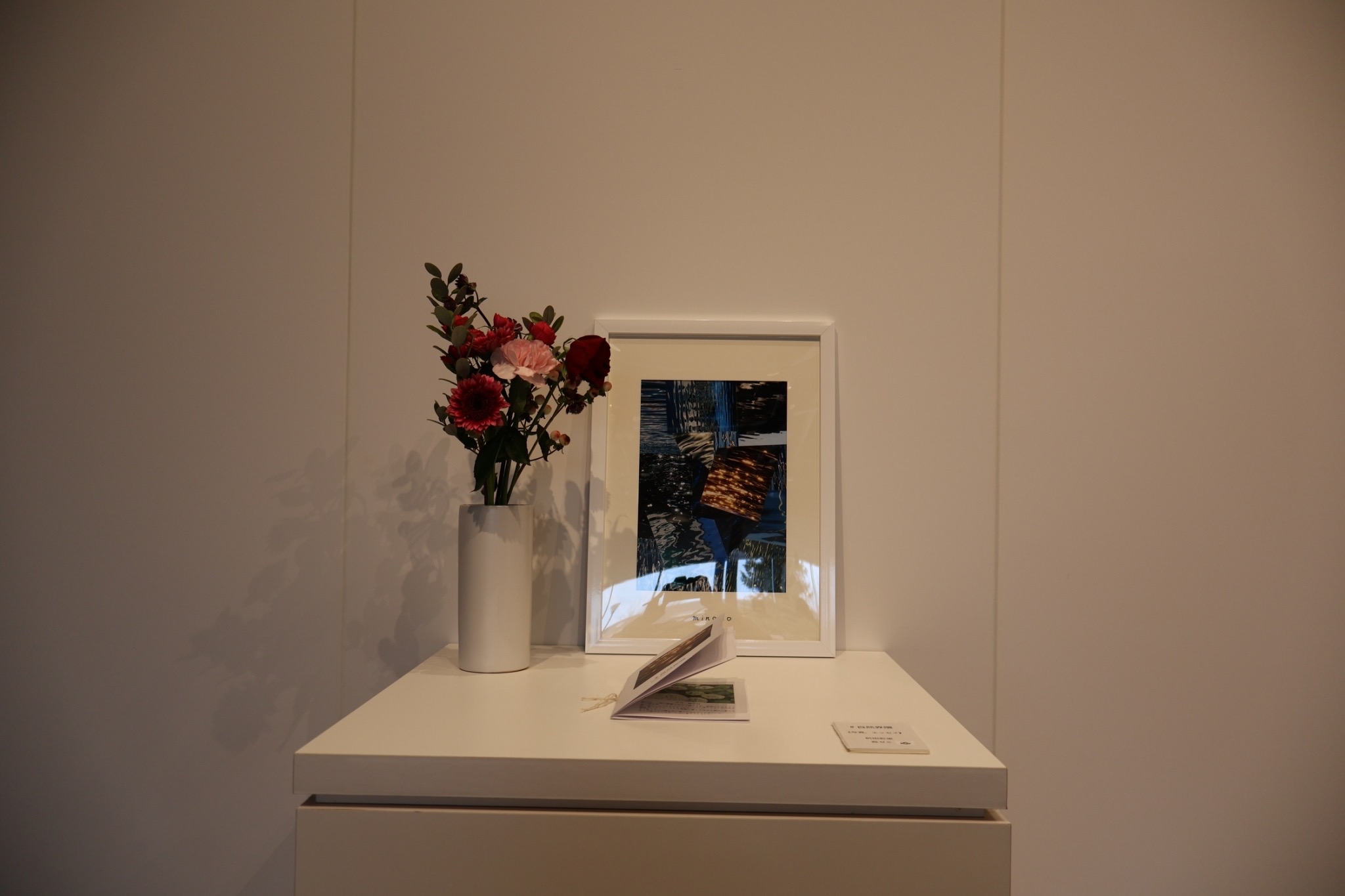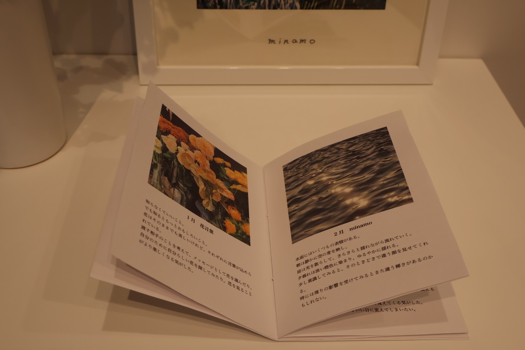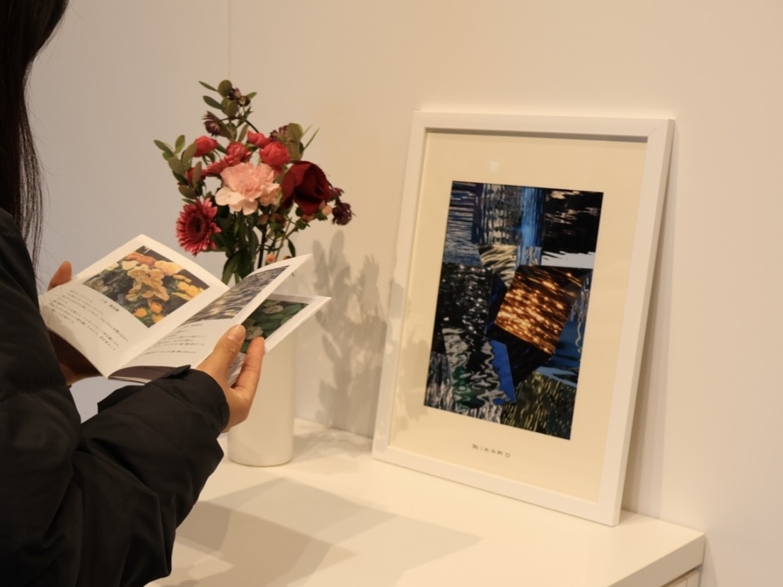 デジタル社会の中で生きる私たちが、無意識のうちに自然を求めていることを表しています。最近SNSでは「#自然界隈」という言葉とともに、青空や海、森などの写真が投稿され、多くの人が癒しを求めて自然のある場所へ行っていることがわかります。私自身も日常の中でふと立ち止まり、空の色や水面の揺らぎ、植物の存在に心を動かされる瞬間があります。このフォトエッセイでは、そんな何気ない自然の情景を言葉と写真で切り取りました。デジタルの中では再現しきれない空の色や、時間とともに変化する水面の表情、植物の静かな生命力を通して、私たちが無意識に求めているものを形にしました。展示では、フォトエッセイの本とともに、生花や水面の写真を組み合わせた作品を展示しました。リアルな自然に触れることで、日常に潜む自然の美しさに気づき、改めてその価値を感じてもらえたらと思います。